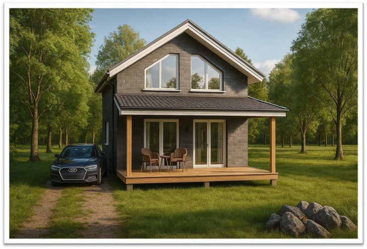 Внешне дом выглядит стильно и современно: чистые линии, лаконичные формы и продуманные архитектурные акценты создают запоминающийся облик.