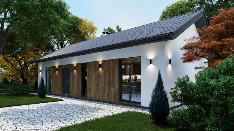 Одноэтажный дом с двускатной крышей, представляет собой классический вариант загородного дома. Двускатная крыша гармонично сочетается с окружающим ландшафтом, а деревянные вставки из лиственницы придают дому эстетичный вид.