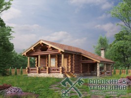 Сруб бани рубленый из бревна кедра диаметра 320мм, площадью 54,5м2 жилая и терраса 95м2. Размер сруба 8,6х11,6 метров по осям с учетом открытой террасы. Простая планировка бани, парная, душевая, комната отдыха, санузел, и большая терраса. Необычный вид создает стропильная система кровли из гнутых стропильных балок. Такая кровля будет дороже за счет гнутых клееных стропильных балок. Сруб рубленый вручную в русскую чашу (охлоп), брёвна окоренные гидро-окоркой (водой под высоким давлением), а так, же это можно сделать скобелем или лопатой, или строганное рубанком. Объем бревна в срубе 65м3.