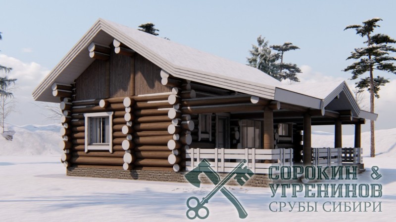 Проект дом-баня из бревна средним диаметром 300мм, размер сруба дома 9,5х11м, объём бревна в срубе 70м3. Дом-баня индивидуальный проект площадью 76м2. Большая терраса с печью барбекю, гостиная, спальная комната, парная, душевая, санузел, красивый внешний вид сруба.